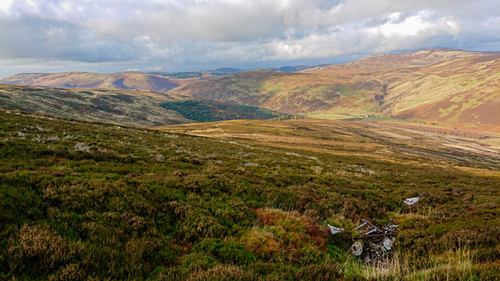 2. West Hill - Boeing B17-G Fortress 44-6504 (PU-M), 303rd Bomb Group/360th Bomb Squadron Molesworth, crashed on the 16th of December 1944. The crew were: George Anderson Kyle (2nd Lt, pilot, injured), James H. Hardy (F/O, co-pilot, injured), Ernest G. Schieferstein (Sgt, engineered, injured), Joel A. Berly (Sgt, radio operator, injured), Fred Holcombe (F/O, navigator, died), Frank R. Turner (Sgt, togglier/bombardier, died), William R. Kaufmann (Sgt, gunner, injured), George p. Smith (Sgt, ball gunner, injured), and Howard F. Delaney (Sgt, tail gunner, injured). The B17-G's mission was to bomb the Marshalling Yards at Ulm in Germany. The weather was not perfect, and as the bombers reached their assembly point over the North Sea their all received a message to abort the mission and head for the assembly point at the RAF Kirmington in Lincolnshire as the fog was by then too thick at their base of origin. The crew spotted ships below and decided to return without dropping the bombs. Shortly after their navigation controls failed, and they ended up 20 miles north of the Cheviot summit and shortly after they hit the summit of West Hill in a blizzard. The nose of the aircraft was crashed in the fall, killing two members of the crew. However, the rest survived the impact. Turner, Holcombe and Kyle who thought they were the only survivors, headed down to the Mounthooly farm. The local farmers, John Dagg of Dunsdale and Frank Moscrop of Southernknowe also heard the plane coming down, and acompanied by the shepherd Arch Bertram, and John Dagg's border collie Sheila, they headed up the hill in the blizzard. Sheila is credited with finding the remaining four survivors of the crash who were huddled together in the peat, sheltering from the blizzard, whilst the shephers searched the wreck for more survivors. John Dagg and Frank Moscrop were awarded the British Empire Medal for their valiant rescue of the injured airmen. Sheila, the border collie, also received a medal. She was the only civilian dog ever awarded the Dicken Medal, which is the animal equivalent of the Victoria Cross. The scroll of thanks that the shepherds received is displayed at the Wooler library. There is still quite a bit left of the aircraft on the West Hill, and the two large craters left by the exploding bombs can be seen as well. However, the bits of the wreckage move with the peat, and the summit of West Hill is extremely boggy, so proceed with caution.